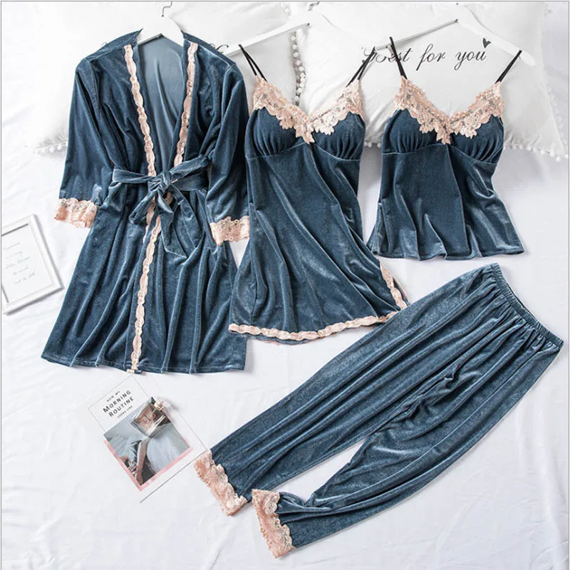 Gown sets Autumn and Winter New Robe Four-Piece Women's Gold Velvet Sexy Sling Trousers Set Female